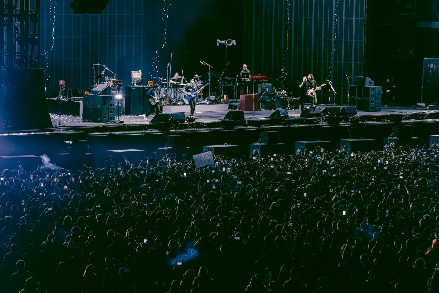 “Teenagers” comienza con una estética muy feliz, muy propia de programa de televisión infantil. Tal vez porque la banda necesita mostrar que siempre hay momentos de luz o porque la historia ficcional también necesita mostrar que en el régimen ni los “niños” se salvan del control. A continuación, “Famous Last Words”, donde no importa que todo el escenario se quede en llamas o que el tema sea uno de los más famosos del grupo… porque es el público, el que, coreando a pulmón, se roba todo el protagonismo.